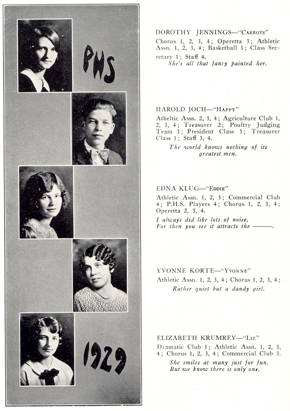 1929 Plymouth High School, Page 16: Dorothy Gennings, Harold Joch, Edna Klug, Yvonne Korte, Elizabeth Krumrey.