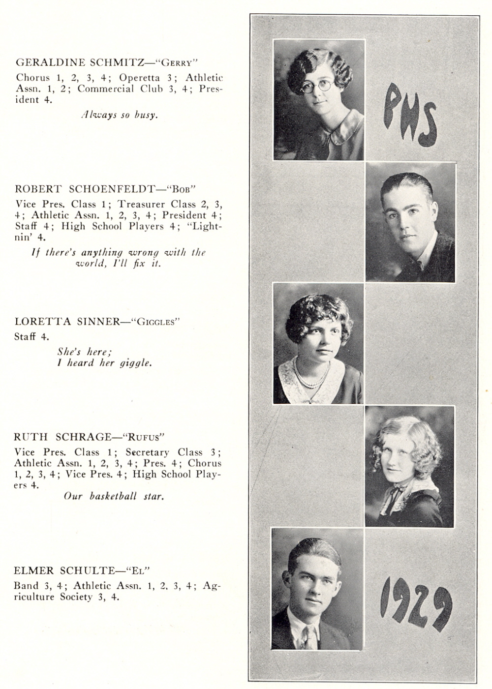 1929 Plymouth High School, Page 19: Geraldine Schmitz, Robert Schoenfeldt, Loretta Sinner, Ruth Schrage, Elmer Schulte.