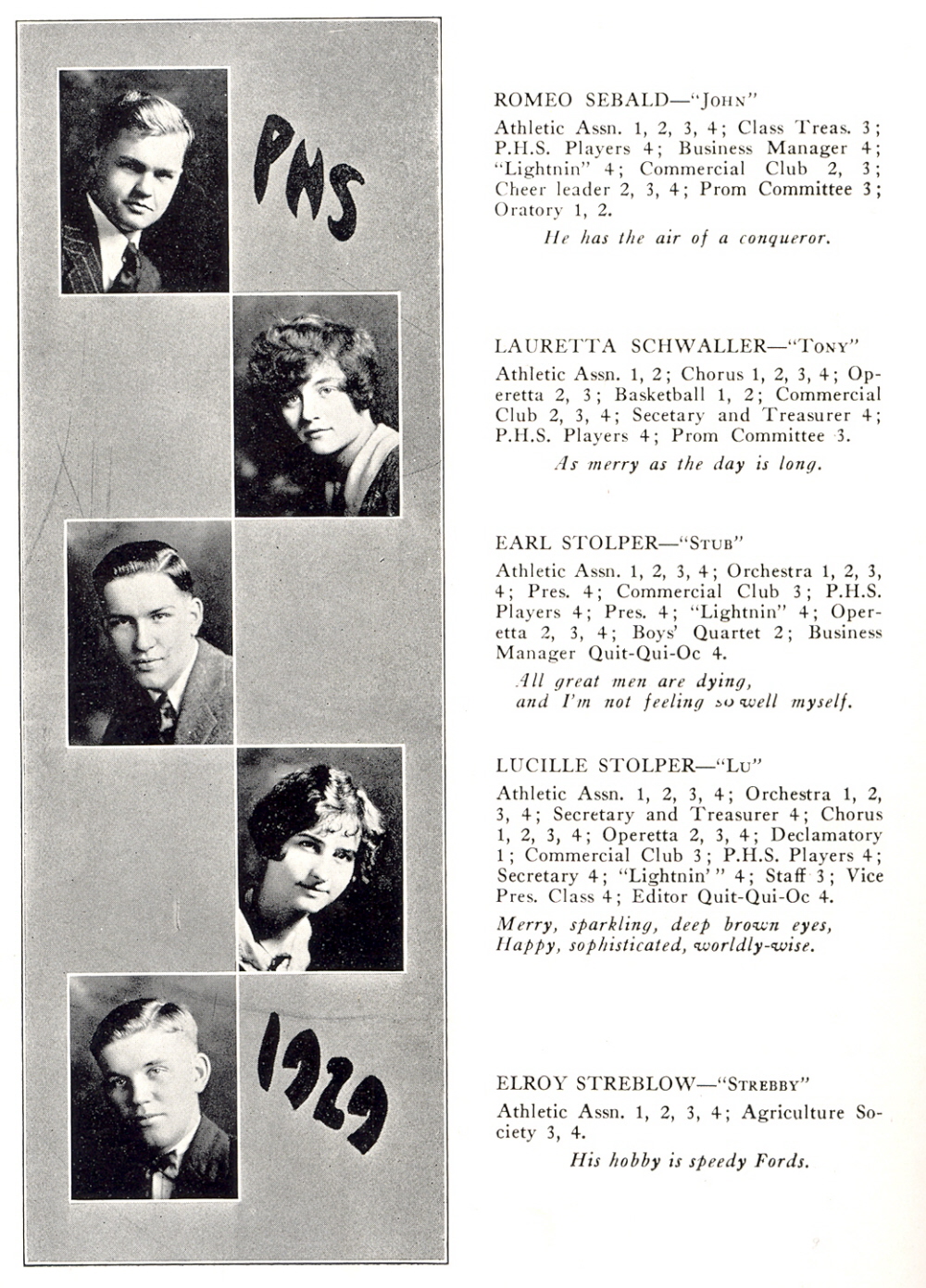 1929 Plymouth High School, Page 20: Romeo Sebald, Lauretta Schwaller, Earl Stolper, Lucille Stolper, Elroy Streblow.