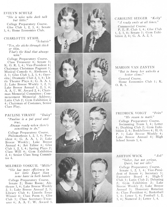1929 Sheboygan High School, Page 39: Evelyn Schulz, Caroline Seeger, Charlotte Stahl, Marion Van Zanten, Pauline Virant, Frederick Voigt, Mildred Voskuil, Ashton Wick.