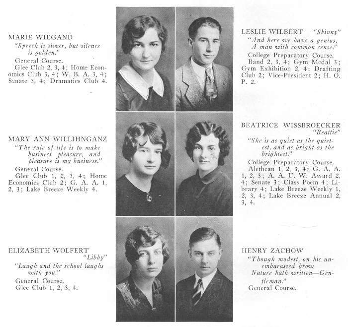 1929 Sheboygan High School, Page 40: Marie Wiegand, Leslie Wilbert, Mary Willihnganz, Beatrice Wisbroecker, Elizabeth Wolfert, Henry Zachow.