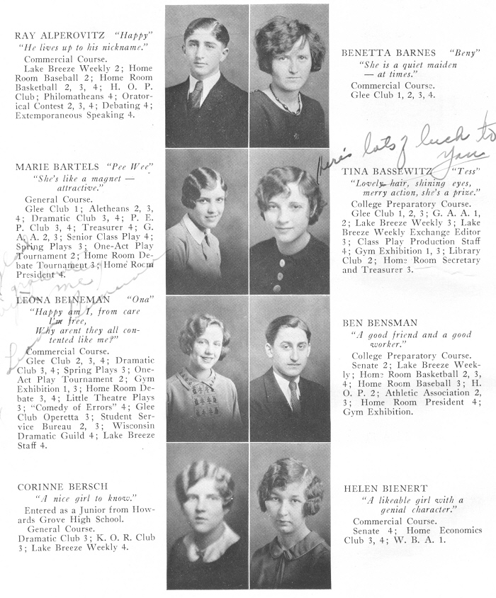 1929 Sheboygan High School, Page 50: Ray Alperovitz, Benetta Barnes, Marie Bartels, Tina Bassewitz, Leona Beineman, Ben Bensman, Corinne Bersch, Helen Bienert.
