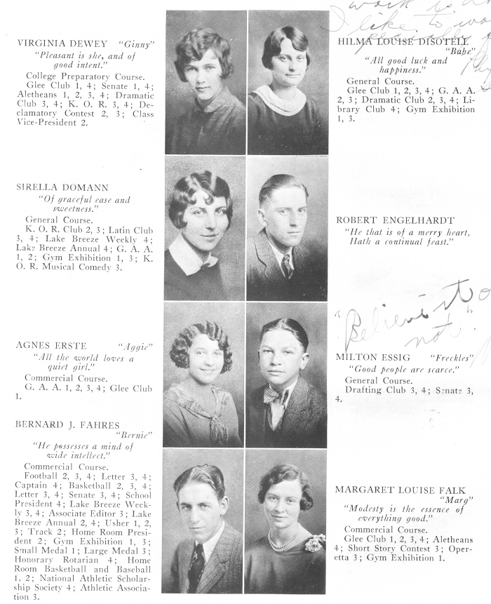 1929 Sheboygan High School, Page 52: Virginia Dewey, Hilma Disotell, Sirella Domann, Robert Engelhardt, Agnes Erste, Milton Essig, Bernard Fahres, Margaret Falk.