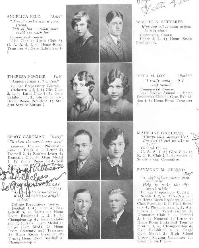 1929 Sheboygan High School, Page 53: Angelica Feld, Walter Fetterer, Theresa Fischer, Ruth Fox, Leroy Gartman, Madeline Gartman, Anton Gatawackas, Raymond Gerend.