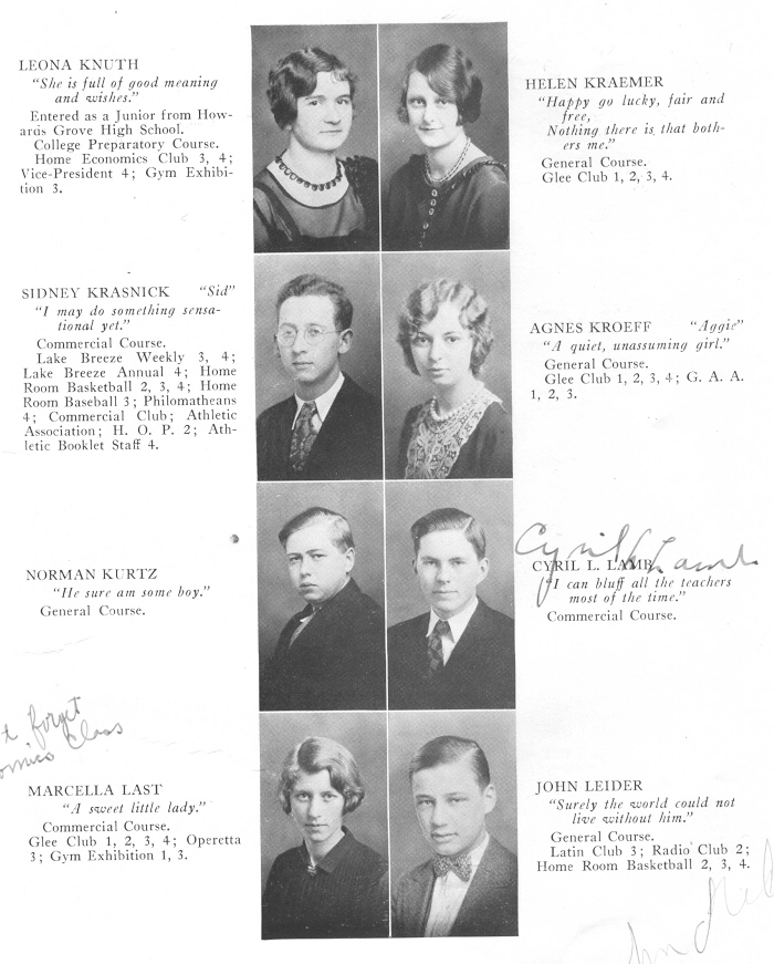 1929 Sheboygan High School, Page 57: Leona Knuth, Helen Kraemer, Sidney Krasnick, Agnes Kroeff, Norman Kurtz, Cyril Lamb, Marcella Last, John Leider.