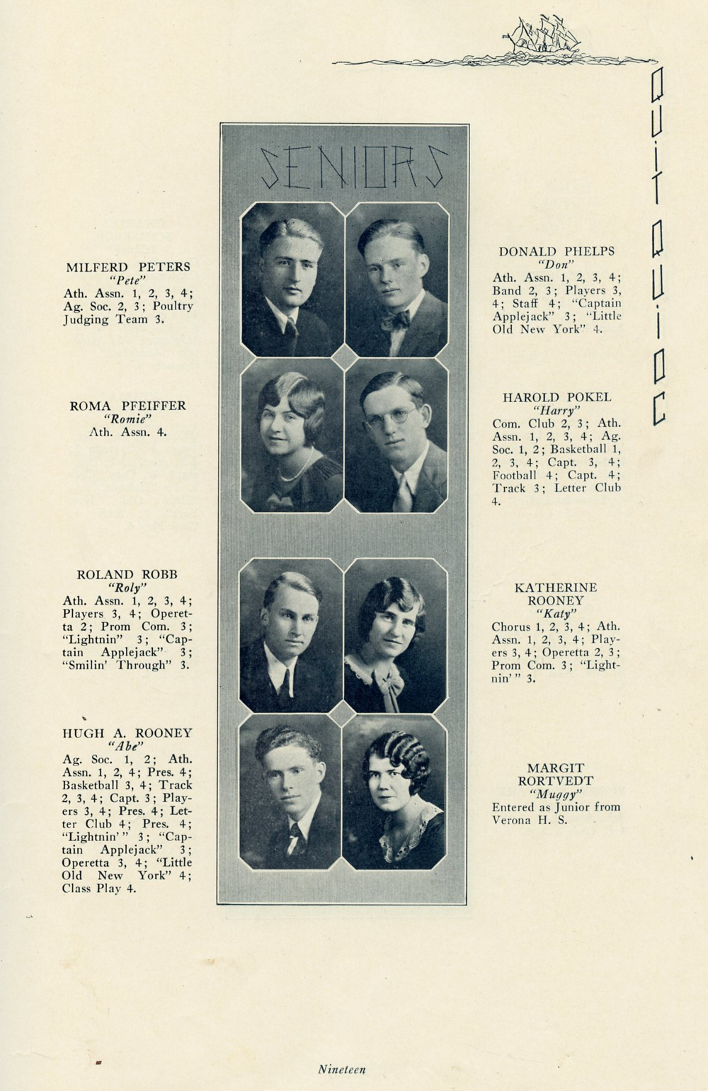 1930 Plymouth High School, Page 19: Milferd Peters, Roma Pfeiffer, Donald Phelps, Harold Pokel, Roland Robb, Hugh A. Rooney, Katherine Rooney, Margit Rortvedt.