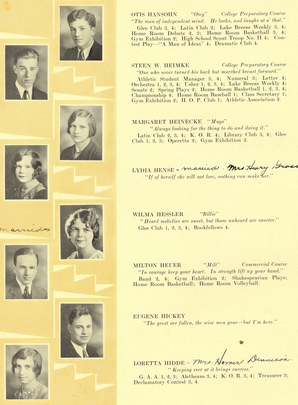 1930 Sheboygan High School, Page 13: Otis Hansohn, Steen Heimke, Margaret Heinecke, Lydia Hense, Wilma Hessler, Milton Heuer, Eugene Hickey, Loretta Hidde.