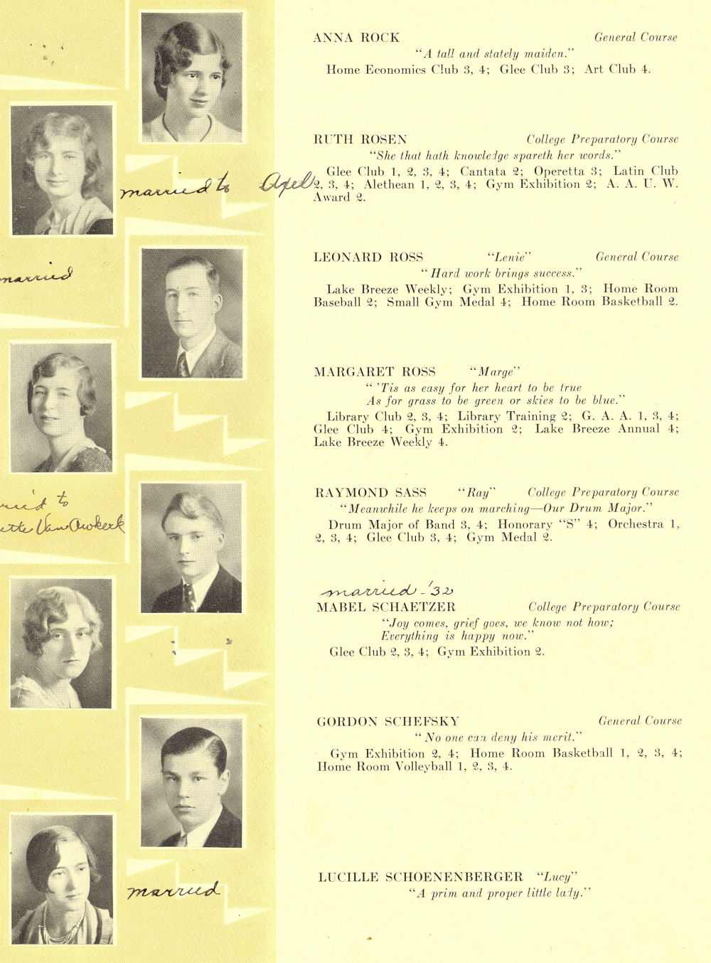 1930 Sheboygan High School, Page 19: Anna Rock, Ruth Rosen, Leonard Ross, Margaret Ross, Raymond Sass, Mabel Schaetzer, Gordon Schefsky, Lucille Schoenenberger.