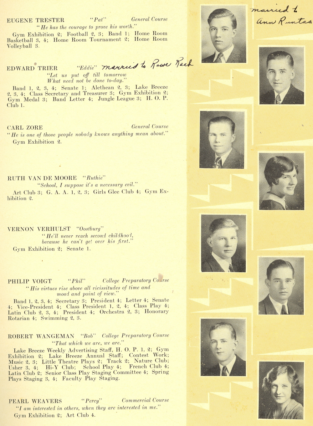 1930 Sheboygan High School, Page 22: Eugene Trester, Edward Trier, Carl Zore, Ruth Van De Moore, Vernon Verhulst, Philip Voigt, Robert Wangeman, Pearl Weavers.