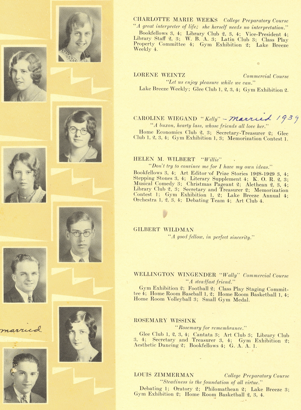 1930 Sheboygan High School, Page 23: Charlotte Weeks, Lorene Weintz, Caroline Wiegand, Helen Wilbert, Gilbert Wildman, Wellington Wingender, Rosemary Wissink, Louis Zimmerman.
