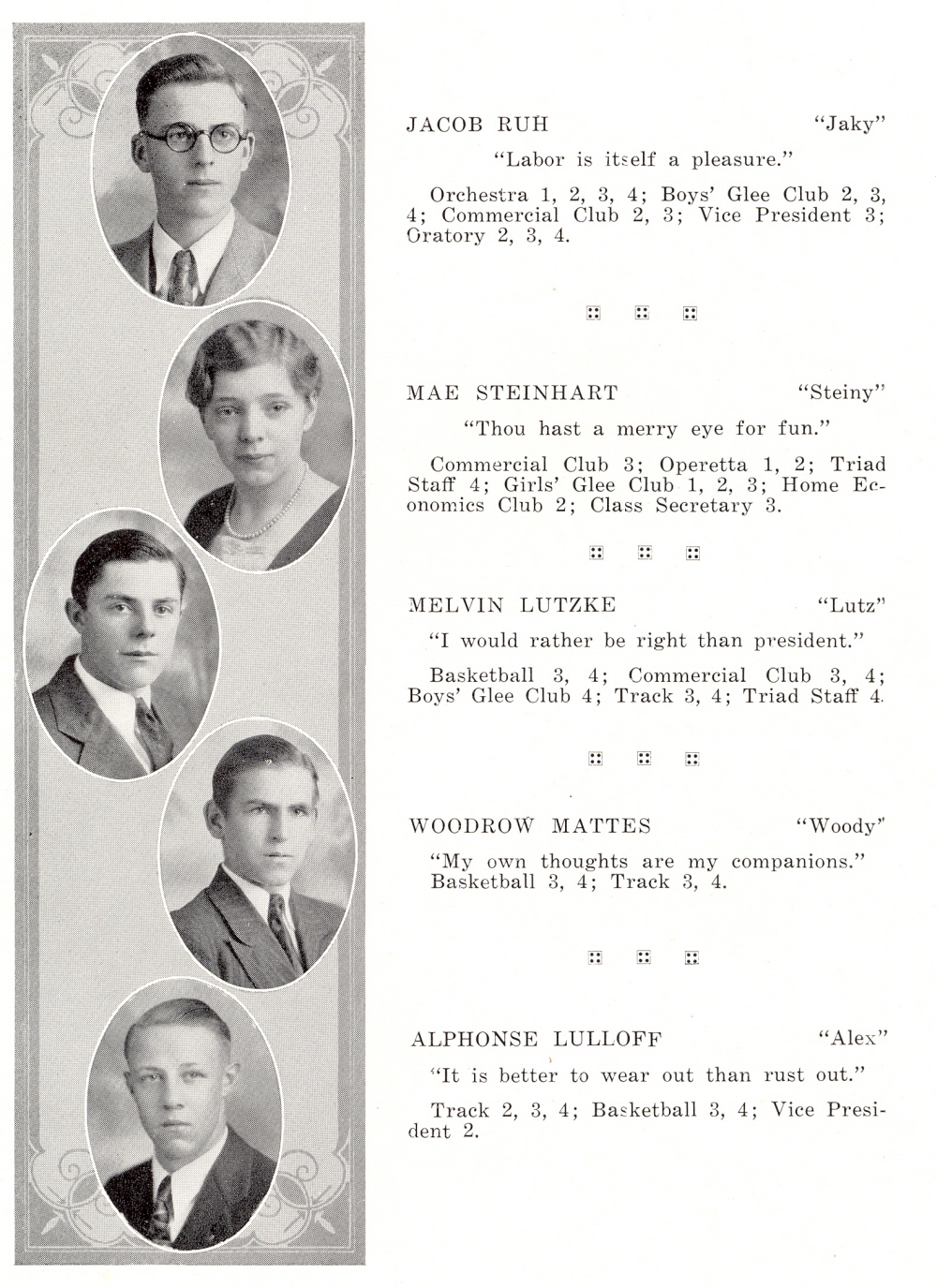 1931 Kiel High School, Page 10: Jacob Ruh, Mae Steinhart, Melvin Lutzke, Woodrow Mattes, Alphonse Lulloff.