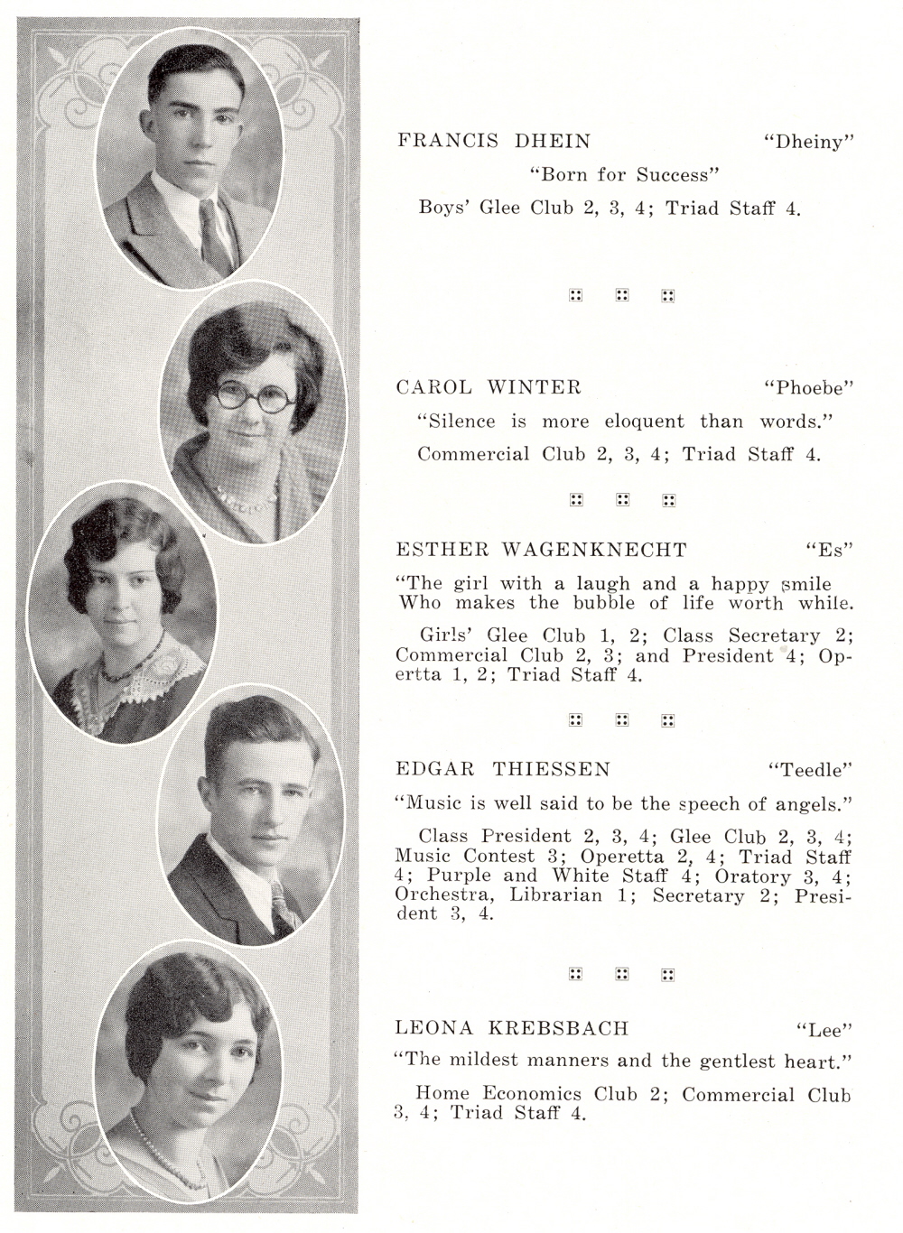 1931 Kiel High School, Page 8: Francis Dhein, Carol Winter, Esther Wagenknecht, Edgar Thiessen, Leona Krebsbach.