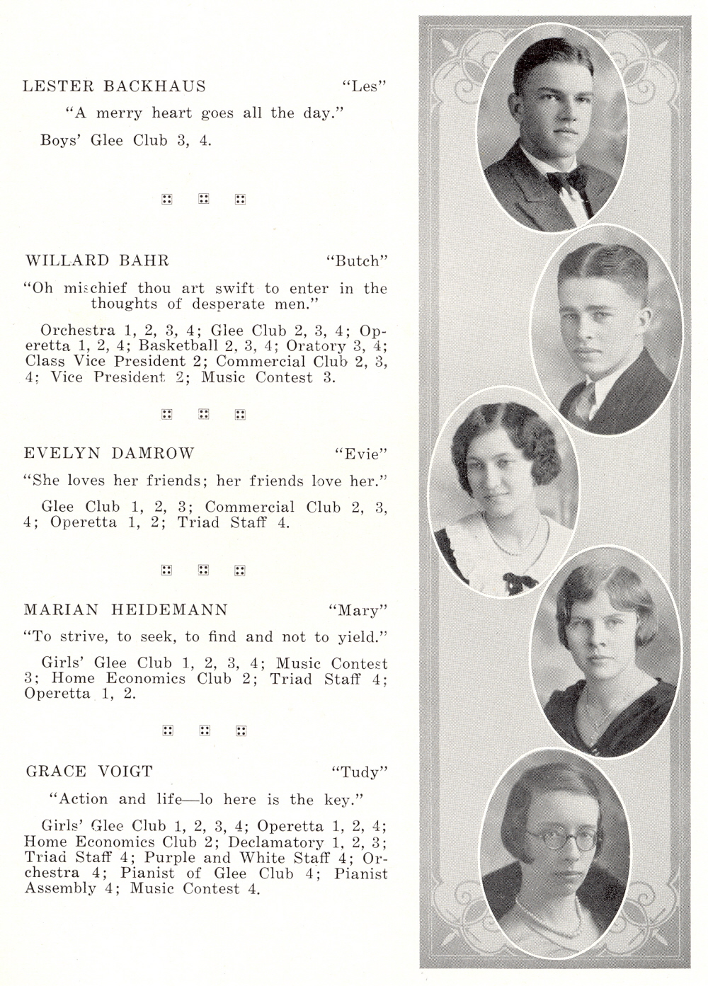 1931 Kiel High School, Page 9: Lester Backhaus, William Bahr, Evelyn Damrow, Marian Heidemann, Grace Voigt.