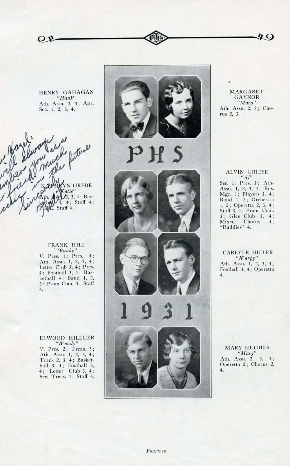 1931 Plymouth High School, Page 14: Henry Gahagan, Margaret Gaynor, Kathryn Grebe, Alvin Griese, Frank Hill, Carlyle Hiller, Elwood Hillger, Mary Hughes.