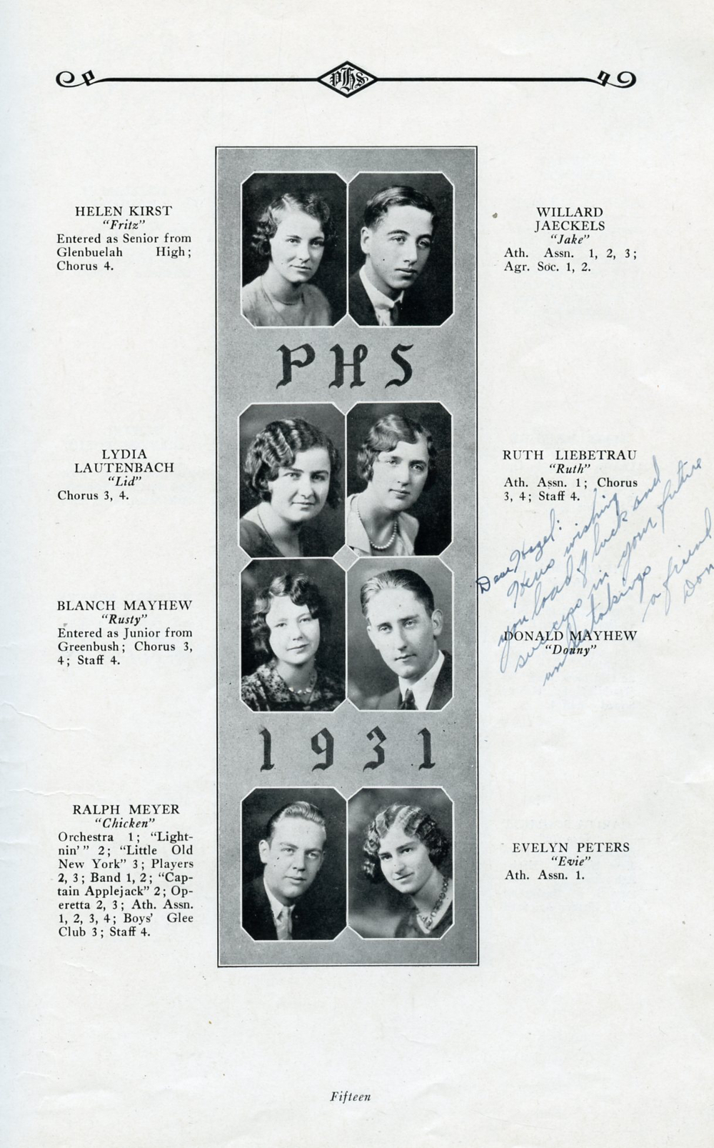 1931 Plymouth High School, Page 15: Helen Kirst, Willard Jaeckels, Lydia Lautenbach, Ruth Liebetrau, Blanch Mayhew, Donald Mayhew, Ralph Meyer, Evelyn Peters.