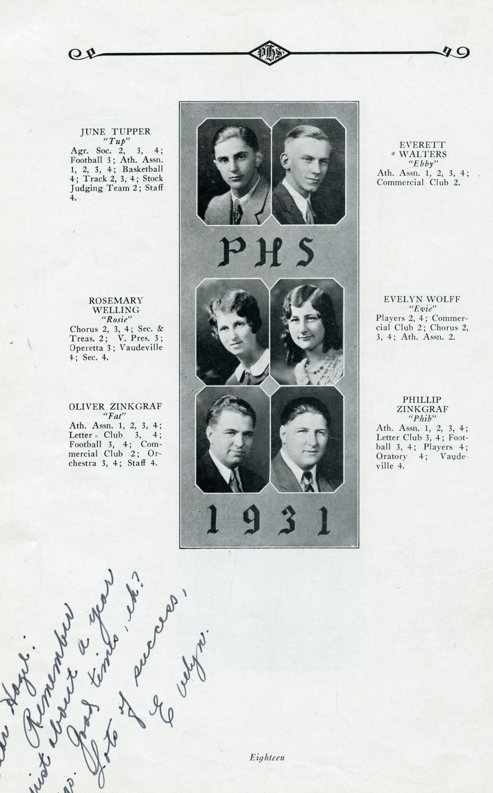 1931 Plymouth High School, Page 18: June Tupper, Everett Walters, Rosemary Welling, Evelyn Wolff, Oliver Zinkgraf, Phillip Zinkgraf.