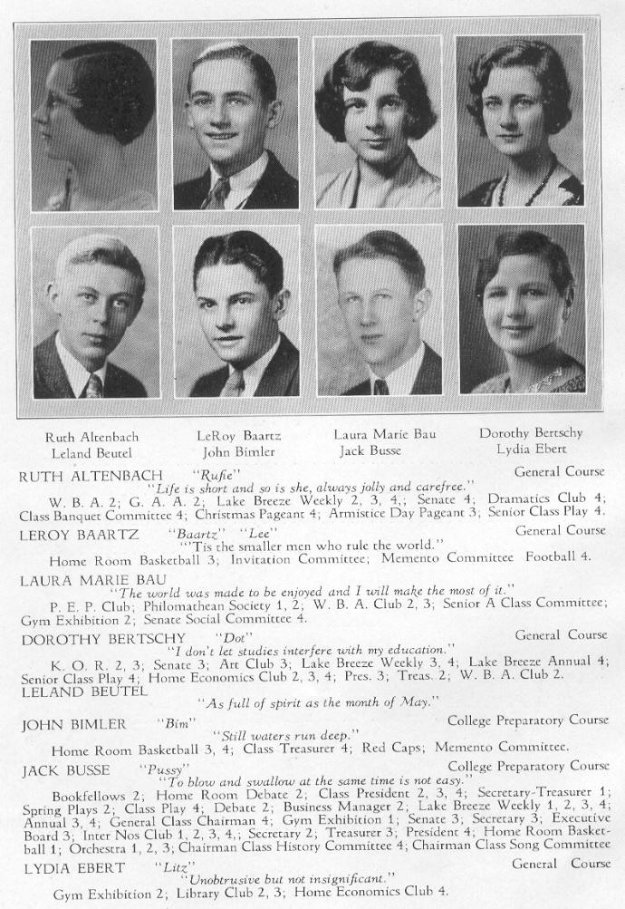 1931 Sheboygan High School, Page 32: Ruth Altenbach, Leroy Baartz, Laura Bau, Dorothy Bertschy, Leland Beutel, John Bimler, Jack Busse, Lydia Ebert.