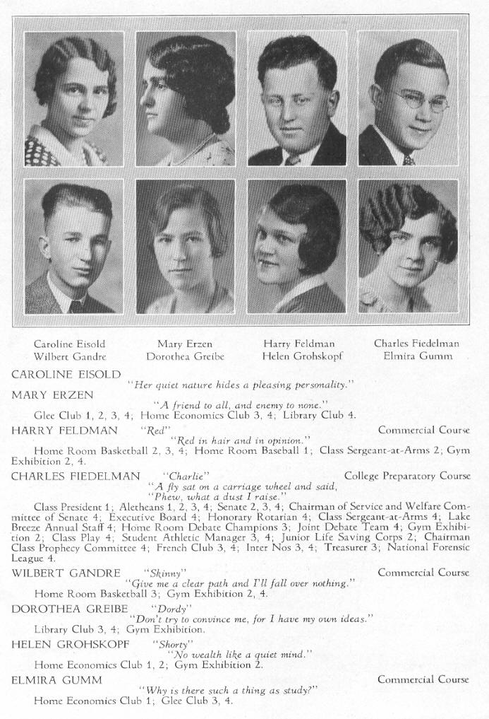1931 Sheboygan High School, Page 33: Caroline Eisold, Mary Erzen, Harry Feldman, Charles Fiedelman, Wilbert Gandre, Dorothea Greibe, Helen Grohskopf, Elmira Gumm.
