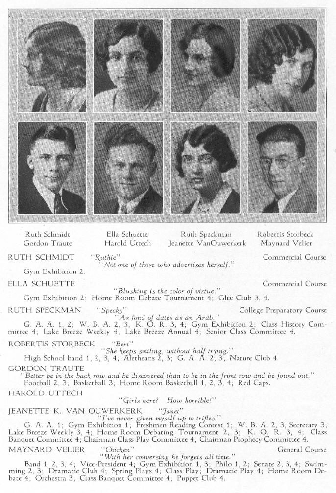 1931 Sheboygan High School, Page 37: Ruth Schmidt, Ella Schuette, Ruth Speckman, Robertis Storbeck, Gordon Traute, Harold Uttech, Jeanette Van Ouwerkerk, Maynard Velier.
