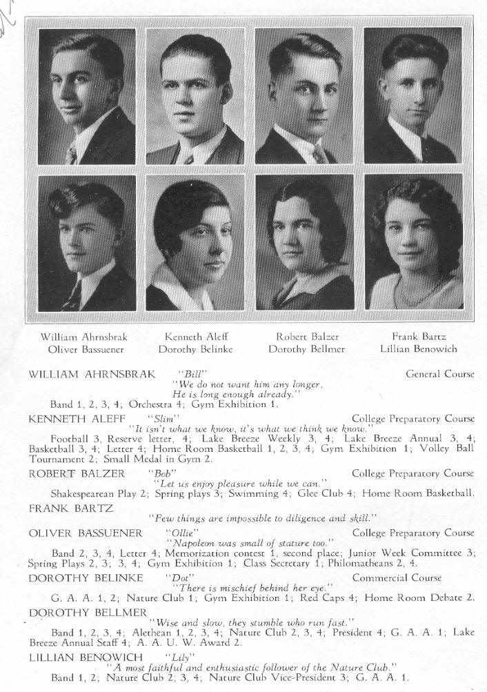 1931 Sheboygan High School, Page 52: William Ahrnsbrak, Kenneth Aleff, Robert Balzer, Frank Bartz, Oliver Bassuener, Dorothy Belinke, Dorothy Bellmer, Lillian Benowich.