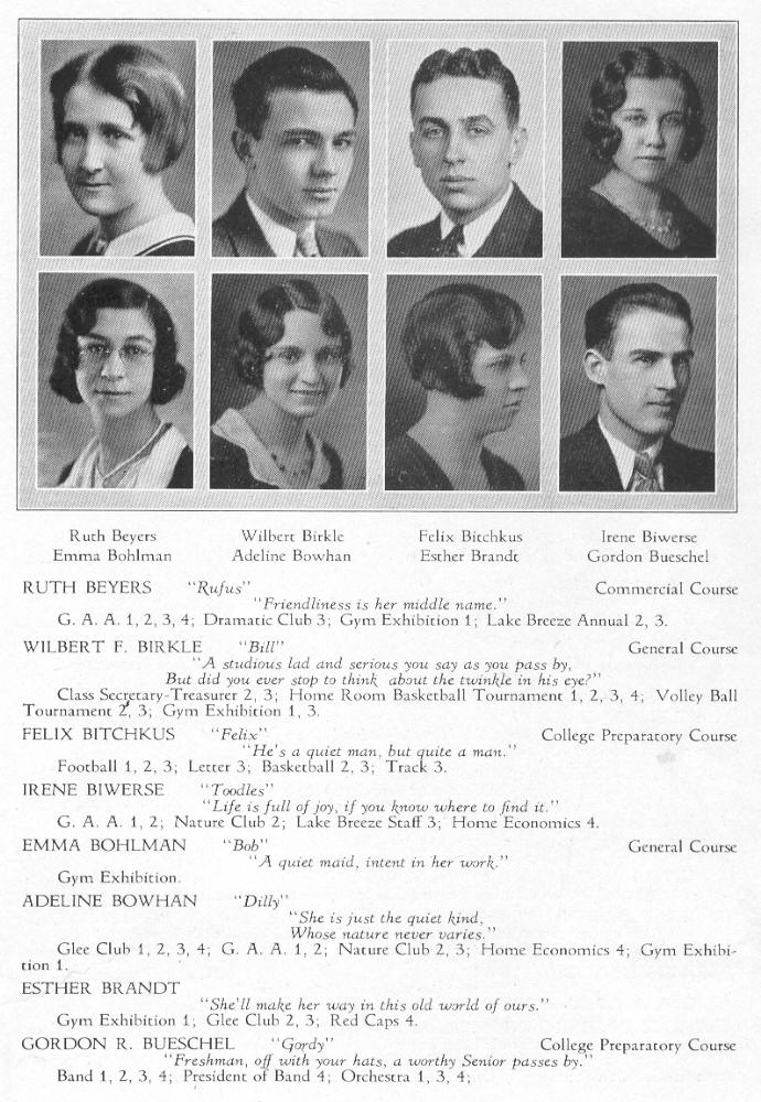 1931 Sheboygan High School, Page 53: Ruth Beyers, Wilbert Birkle, Felix Bitchkus, Irene Biwerse, Emma Bohlman, Adeline Bowhan, Esther Brandt, Gordon Bueschel.