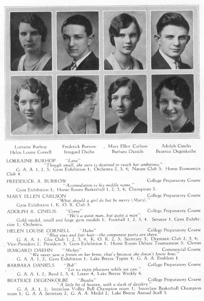 1931 Sheboygan High School, Page 54: Lorraine Burhop, Frederick Burrow, Mary Carlson, Adolph Cinelis, Helen Cornell, Irmgard Daehn, Barbara Daniels, Beatrice Degenkolbe.