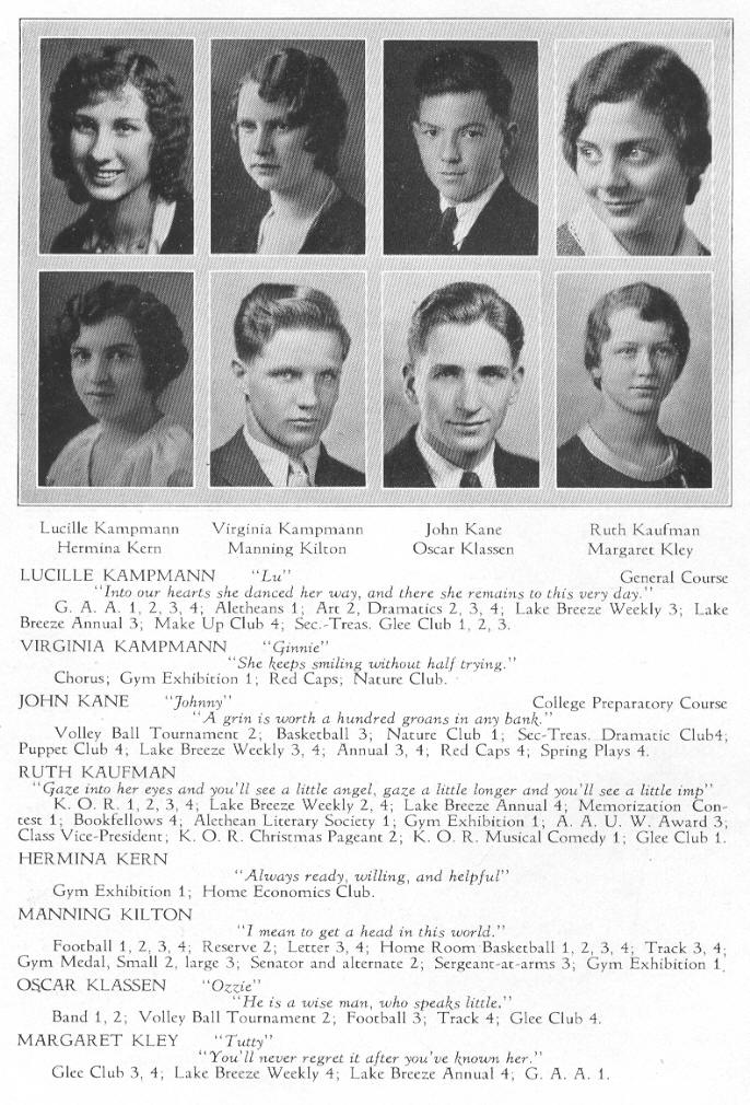 1931 Sheboygan High School, Page 62: Lucille Kampmann, Virginia Kampmann, John Kane, Ruth Kaufman, Hermina Kern, Manning Kilton, Oscar Klassen, Margaret Kley.