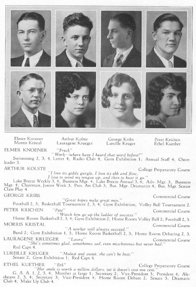 1931 Sheboygan High School, Page 63: Elmer Knoener, Arthur Kolste, George Kribs, Peter Krichen, Morris Kristal, Lauragene Krueger, Lurielle Kruger, Ethel Kuether.