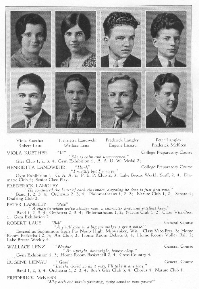 1931 Sheboygan High School, Page 64: Viola Kuether, Henrietta Landwehr, Frederick Langley, Peter Langley, Robert Laue, Wallace Lenz, Eugene Lienau, Frederick McKeen.