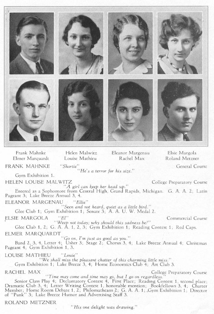 1931 Sheboygan High School, Page 65: Frank Mahnke, Helen Malwitz, Eleanor Margenau, Elsie Margola, Elmer Marquardt, Louise Mathieu, Rachel Max, Roland Metzner.
