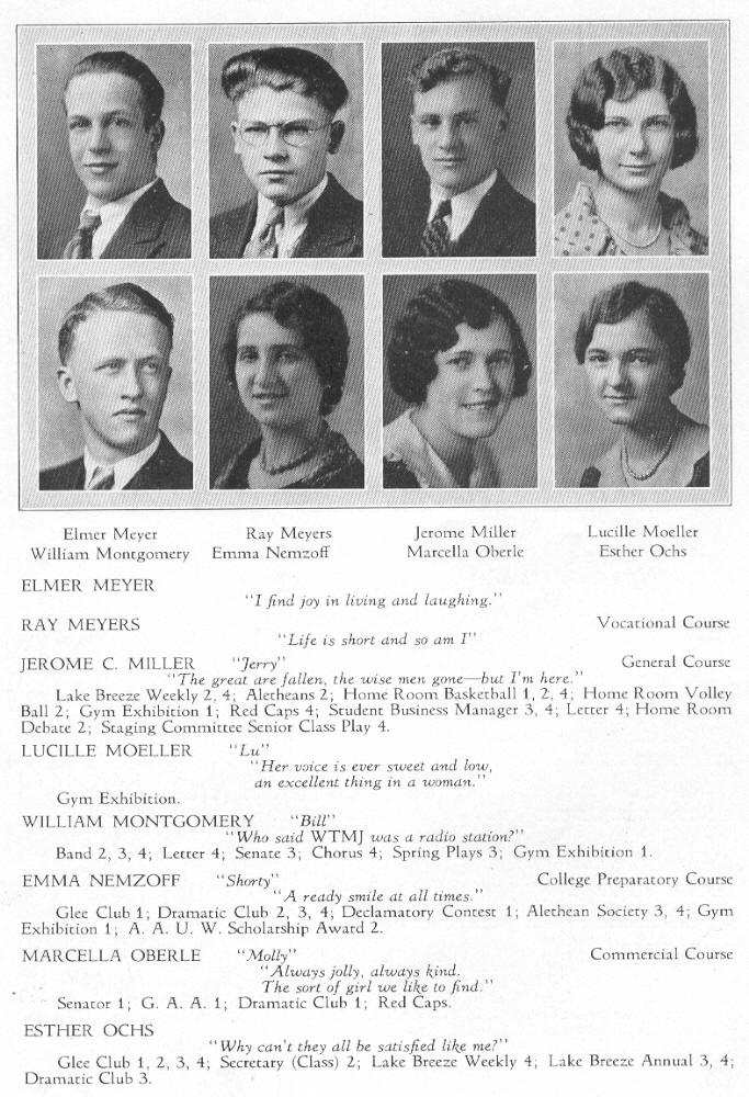 1931 Sheboygan High School, Page 66: Elmer Meyer, Ray Meyers, Jerome Miller, Lucille Moeller, William Montgomery, Emma Nemzoff, Marcella Oberle, Esther Ochs.