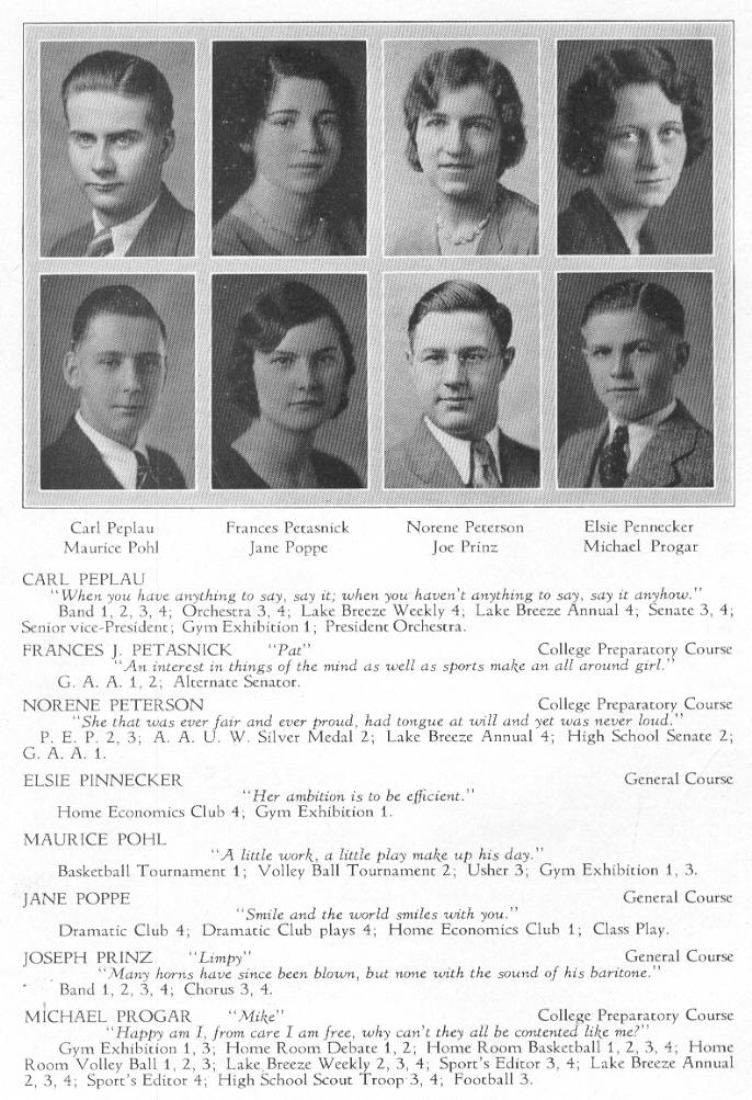 1931 Sheboygan High School, Page 68: Carl Peplau, Frances Petasnick, Norene Peterson, Elsie Pinnecker, Maurice Pohl, Jane Poppe, Joseph Prinz, Michael Progar.