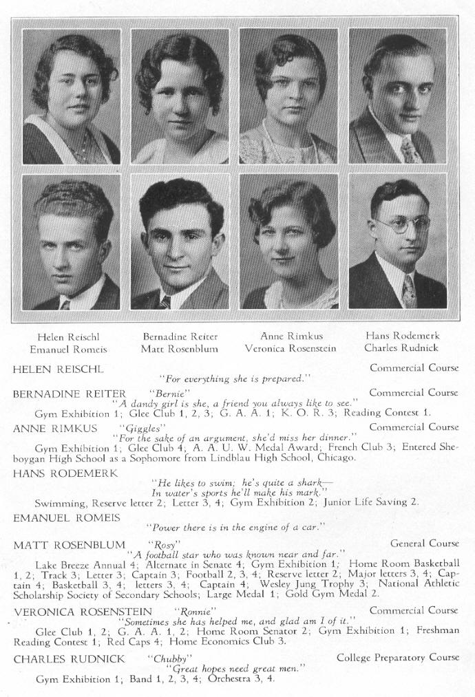 1931 Sheboygan High School, Page 70: Helen Reischl, Bernadine Reiter, Anne Rimkus, Hans Rodemerk, Emanuel Romeis, Matt Rosenblum, Veronica Rosenstein, Charles Rudnick.