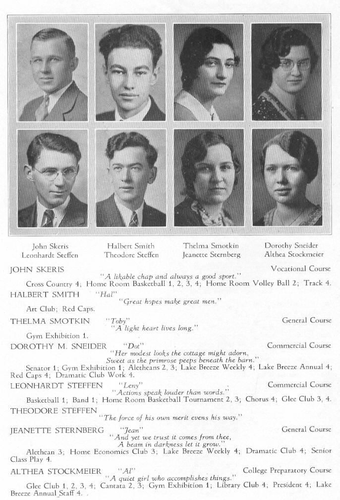 1931 Sheboygan High School, Page 73: John Skeris, Halbert Smith, Thelma Smotkin, Dorothy Sneider, Leonhardt Steffen, Theodore Steffen, Jeanette Sternberg, Althea Stockmeier.