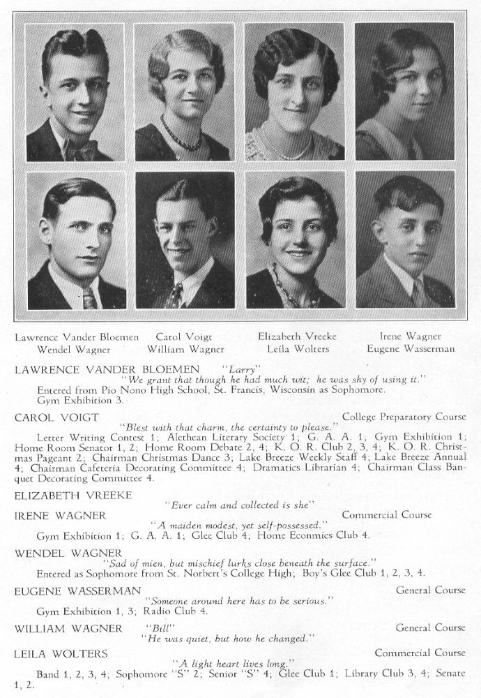1931 Sheboygan High School, Page 75: Lawrence Vander Bloeman, Carol Voigt, Elizabeth Vreeke, Irene Wagner, Wendel Wagner, Eugene Wasserman, William Wagner, Leila Wolters.