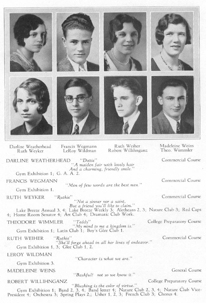 1931 Sheboygan High School, Page 76: Darlene Weatherhead, Francis Wegmann, Ruth Weyker, Theodore Wimmler, Ruth Weiher, Leroy Wildman, Madeleine Weins, Robert Willihnganz.