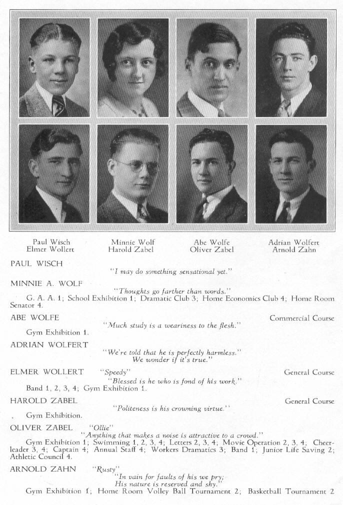 1931 Sheboygan High School, Page 77: Paul Wisch, Minnie Wolf, Abe Wolfe, Adrian Wolfert, Elmer Wollert, Harold Zabel, Oliver Zabel, Arnold Zahn.