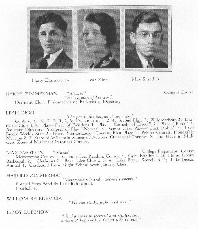 1931 Sheboygan High School, Page 78: Harry Zimmerman, Leah Zion, Max Smotkin, Harold Zimmerman, William Belekevicia, LeRoy Lubenow.