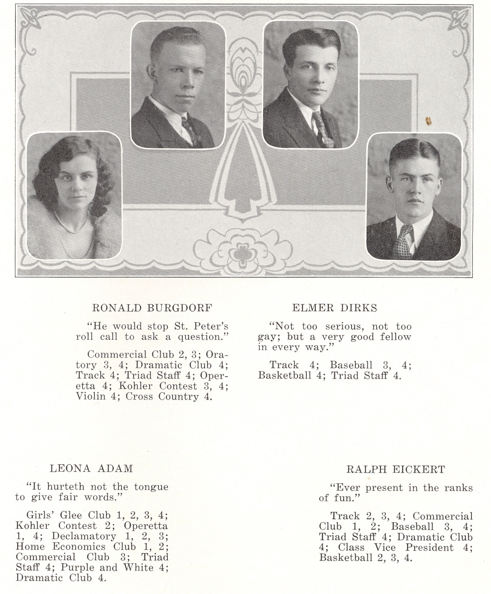 1932 Kiel High School, Page 10: Ronald Burgdorf, Elmer Dirks, Leon Adam, Ralph Eickert.