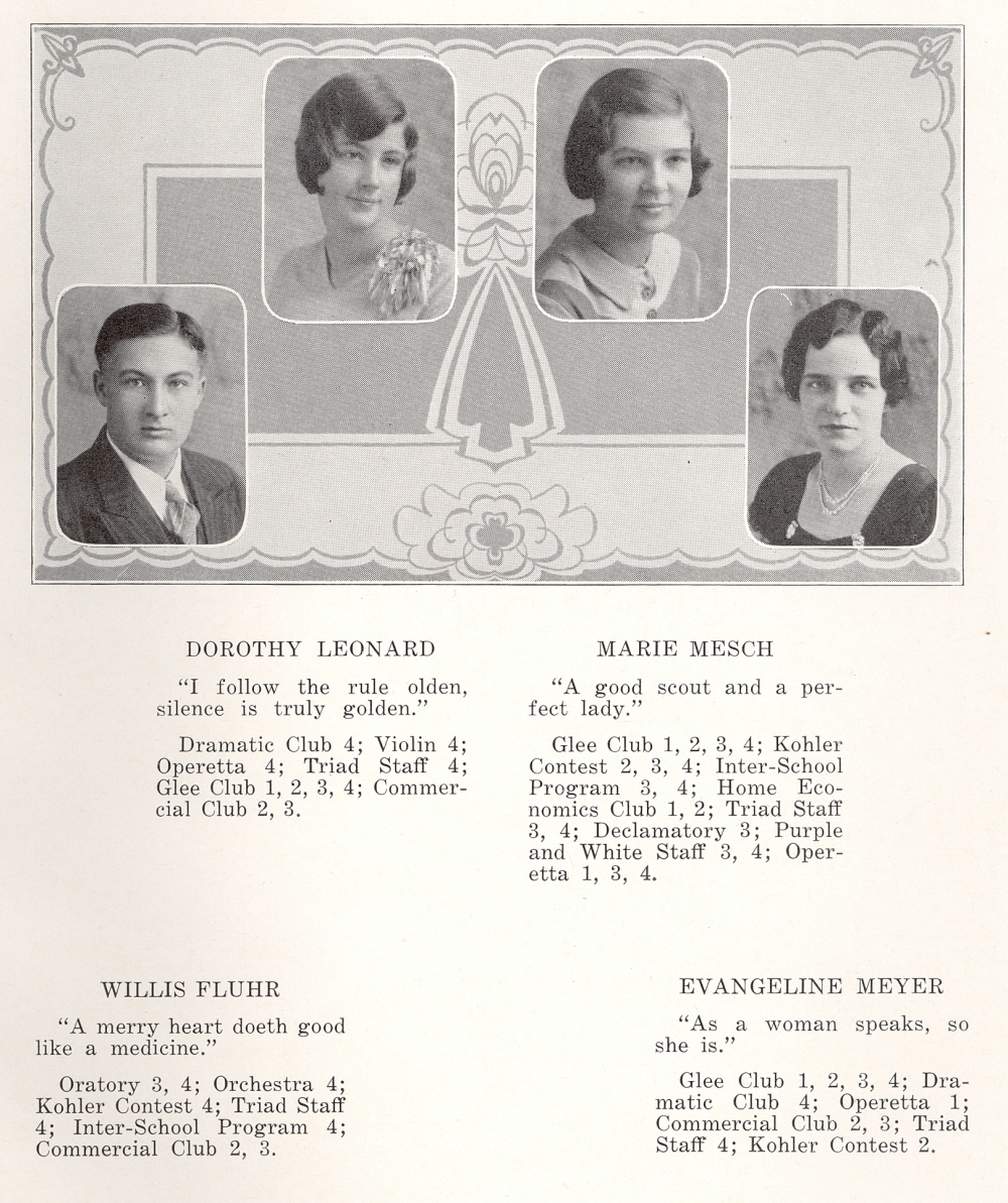 1932 Kiel High School, Page 11: Dorothy Leonard, Marie Mesch, Willis Fluhr, Evangeline Meyer.