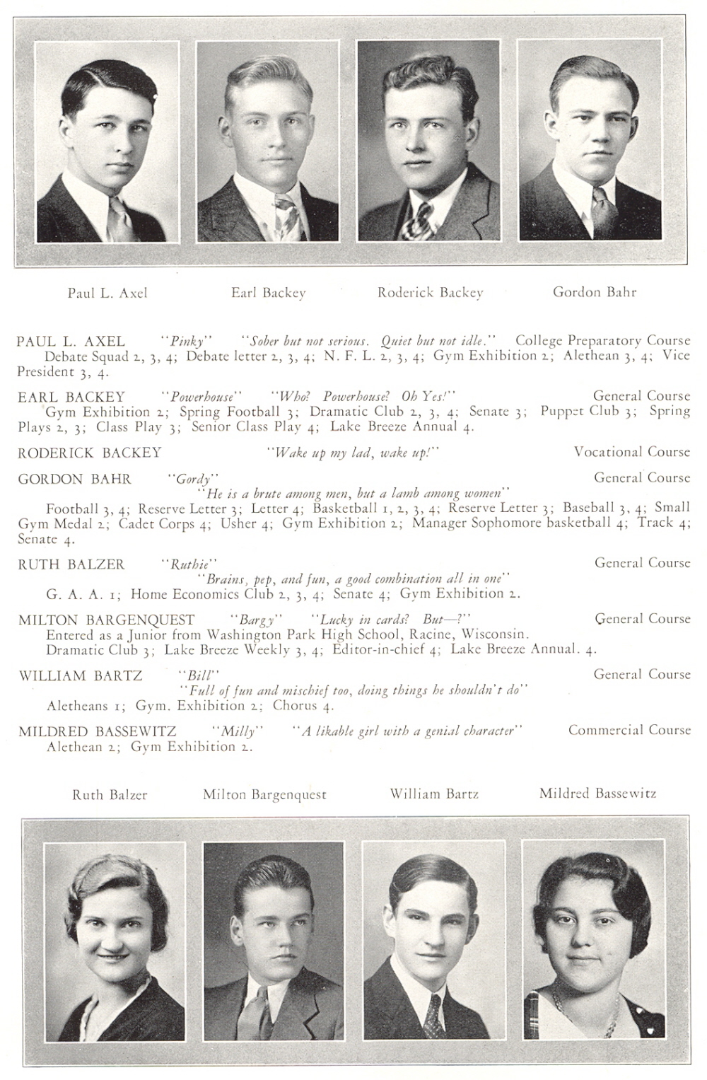 1932 Sheboygan High School, Page 39: Paul Axel, Earl Backey, Roderick Backey, Gordon Bahr, Ruth Balzer, Milton Bargenquest, William Bartz, Mildred Bassewitz.