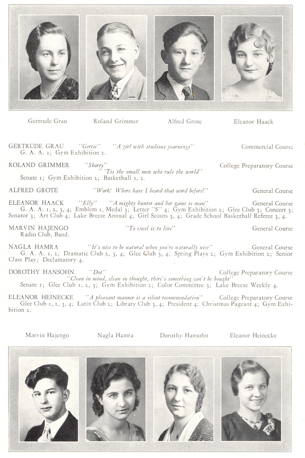 1932 Sheboygan High School, Page 47: Gertrude Grau, Roland Grimmer, Alfred Grote, Eleanor Haack, Marvin Hajengo, Nagla Hamra, Dorothy Hansohn, Eleanor Heinecke.
