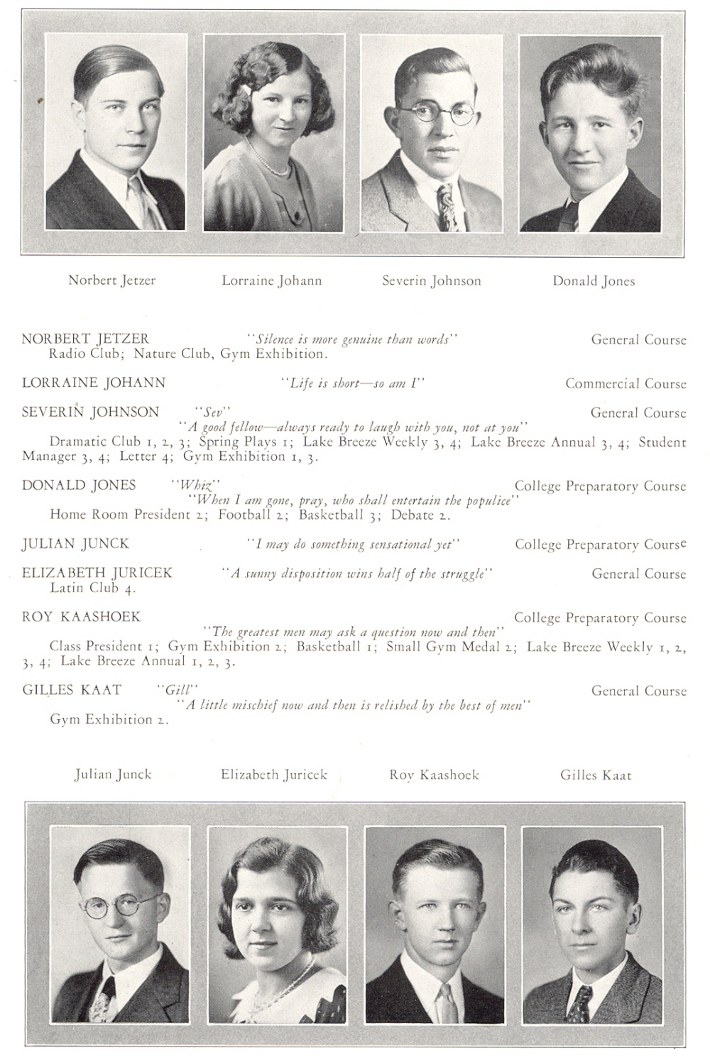 1932 Sheboygan High School, Page 52: Norbert Jetzer, Lorraine Johann, Severin Johnson, Donald Jones, Julian Junck, Elizabeth Juricek, Roy Kaashoek, Gilles Kaat.