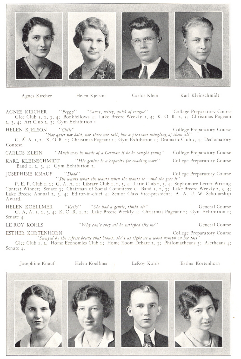 1932 Sheboygan High School, Page 54: Agnes Kircher, Helen Kjelson, Carlos Klein, Karl Kleinschmidt, Josephine Knauf, Helen Koellmer, Le Roy Kohls, Esther Kortenhorn.