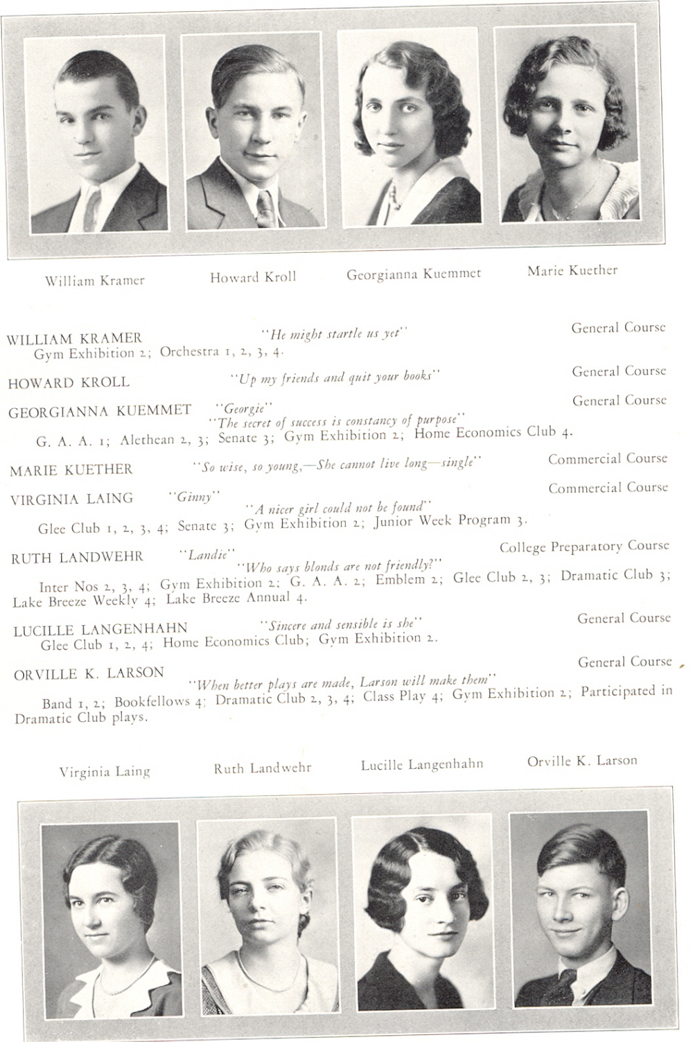 1932 Sheboygan High School, Page 55: William Kramer, Howard Kroll, Georgianna Kuemmet, Marie Kuether, Virginia Laing, Ruth Landwehr, Lucille Langenhahn, Orville Larson.