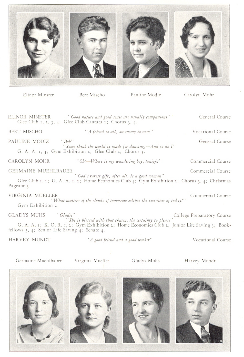 1932 Sheboygan High School, Page 59: Elinor Minster, Bert Mischo, Pauline Modiz, Carolyn Mohr, Germaine Muehlbauer, Virginia Mueller, Gladys Muhs, Harvey Mundt.