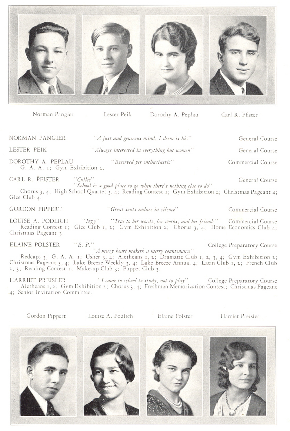 1932 Sheboygan High School, Page 62: Norman Pangier, Lester Peik, Dorothy Peplau, Carl Pfister, Gordon Pippert, Louise Podlich, Elaine Polster, Harriet Priesler.