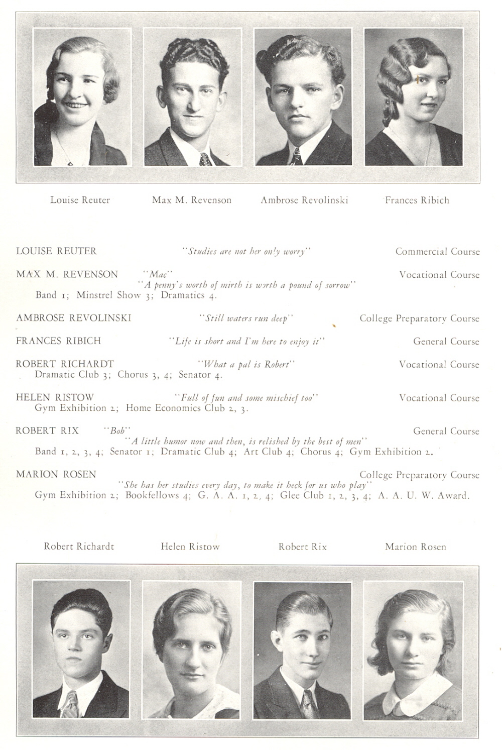 1932 Sheboygan High School, Page 65: Louise Reuter, Max Revenson, Ambrose Revolinski, Frances Ribich, Robert Richardt, Helen Ristow, Robert Rix, Marion Rosen.