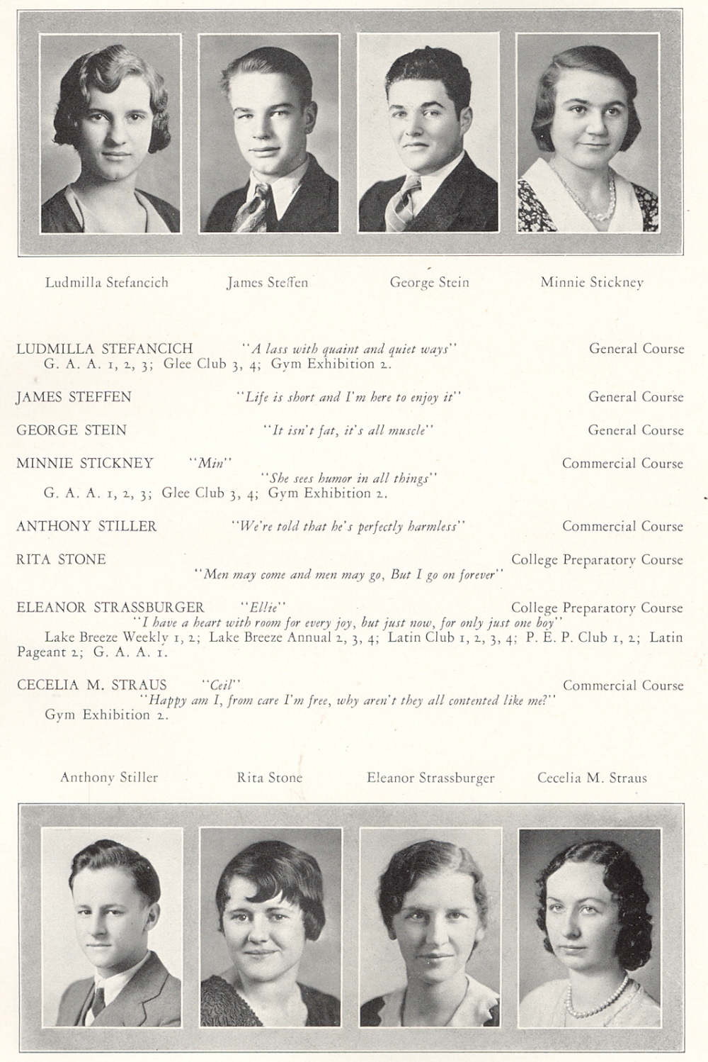 1932 Sheboygan High School, Page 71: Ludmilla Stefancich, James Steffen, George Stein, Minnie Stickney, Anthony Stiller, Rita Stone, Eleanor Strassburger, Cecelia Straus.