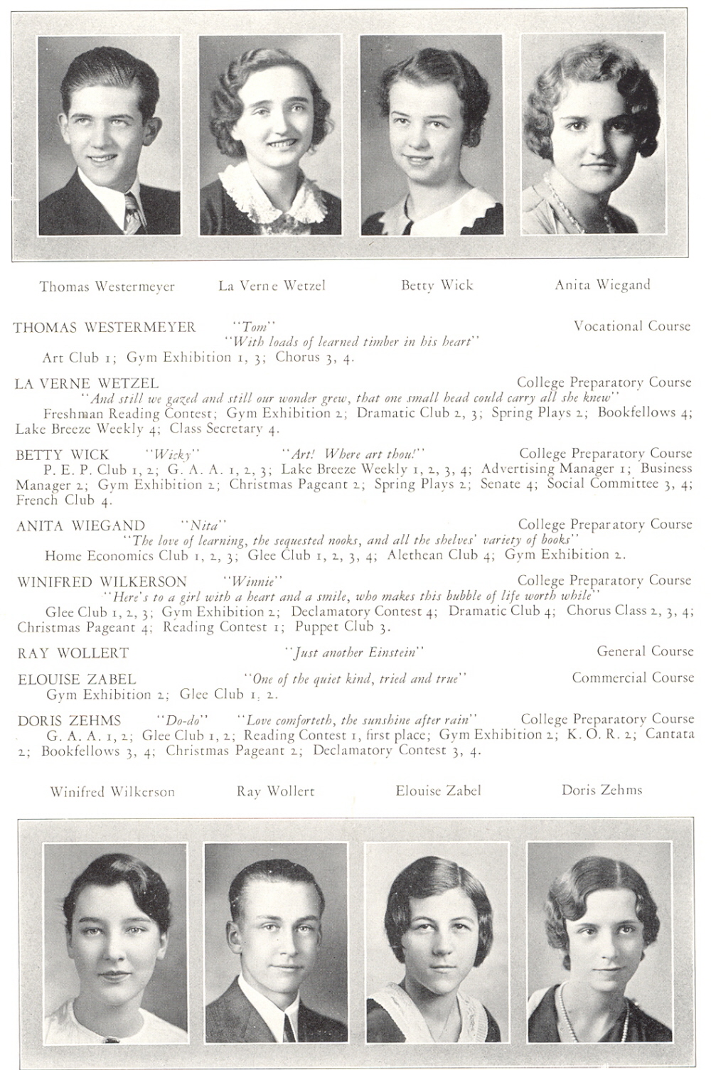 1932 Sheboygan High School, Page 76: Thomas Westermeyer, La Verne Wetzel, Betty Wick, Anita Wiegand, Winifred Wilkerson, Ray Wollert, Elouise Zabel, Doris Zehms.